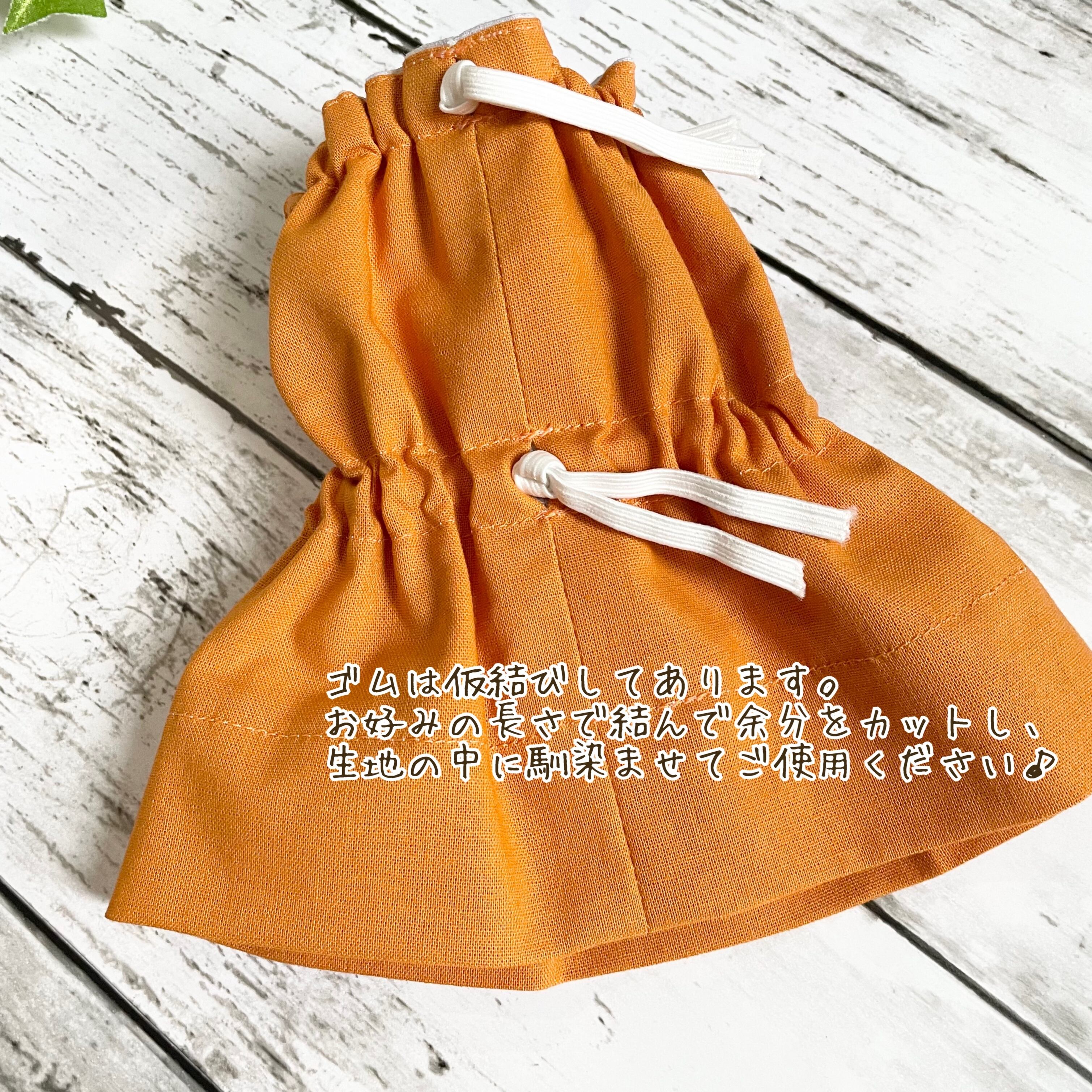 ちょうど良いキツさに調整して固結びし、余分なゴムをカットした上で結び目を生地の中に入れ馴染ませてください。(画像4枚目の状態でお届けいたします)